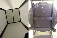 To perform the rod and frame task, an apparatus consisting of a rod in a square frame is used. An example commercial apparatus can be seen in picture 1. When the participant is being tested using the apparatus, their head is fastened firmly in the chin rest to prevent the participant from collecting visual cues from outside of the apparatus. The rod and frame are shown in the center of the far end of the apparatus, which provides a frame of reference to the participant. Both the participant and the experimenter are able to adjust the orientation of the rod, while only the experimenter can adjust the frame orientation by using the appropriate knobs on the apparatus, as seen in picture 2. The experimenter is able to see the exact degree measurement of the rod and frame from vertical, while the participant sees the physical rod and frame inside the apparatus.
