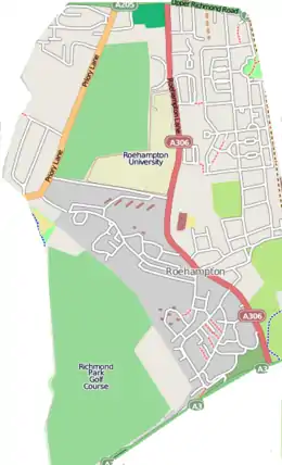 Roehampton is a suburban district in southwest London, in the Putney SW15 postal district, and takes up a far western strip running north to south of the London Borough of Wandsworth.[2] It occupies high land in the south that adjoins its northern part, Richmond Park, Richmond Park Golf Courses, and Putney Heath. At its southern extreme, it forms an east–west strip heritage conservation area and a street built in the 1980s comprising Roehampton Vale. The Vale straddles the A3 which in turn adjoins many sports pitches, Putney Vale, and Wimbledon Common. Altogether, Roehampton takes up a long area between the former village of Barnes to the north, Putney to the east, and the green areas around its southern part, beyond which are Kingston Vale and Raynes Park, uniquely in its borough distant from a railway station. Roehampton's most densely populated area has a long border with the largest of London's Royal Parks, Richmond Park. The area is centred about 6.3 miles (roughly 10 km) south-west of Charing Cross and gained its first church in the 19th century in its narrow central conservation area between the Alton Estate and Dover House Estate.