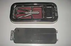 The case was a rigid rectangular frame enclosed by two detachable lids; one lid carried a stone and the other a leather. The lids could not be interchanged. With a lid removed, oscillating a handle drove a shaft along the frame. In both directions pinions on the shaft engaged with racks on the case to rotate the shaft to either push the blade forward against the stone or drag it against the strop.[3][4][5][6] It was easy to use, fast and safe. Sharpening was noisy as each change of direction rotated the blade to slap against stone or leather.