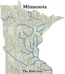 The Root River flows for 80 miles (130 km)[1] through the Driftless Area of southeastern Minnesota and is a tributary of the Upper Mississippi River. It is an excellent river for canoeing. The gentle to moderate flowing river drops an average of 3.4 ft/mile from Chatfield, Minnesota, to its pour point in the Mississippi River into Navigation Pool 7 just south of La Crosse, Wisconsin.
