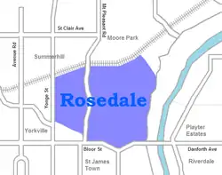 Rosedale's boundaries consist of the CPR railway tracks to the north, Yonge Street to the west, Aylmer Avenue and Rosedale Valley Road to the south,[6][7][8] and Bayview Avenue to the east. The neighbourhood is within the City of Toronto's Rosedale-Moore Park neighbourhood. The neighbourhood is divided into a north and south portion by the Park Drive Ravine.