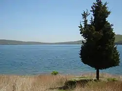 The Round Valley Reservoir in Clinton Township in Hunterdon County, New Jersey, United States, was formed in 1960 when the New Jersey Water Authority constructed two large dams and flooded a large valley. The reservoir is named after the naturally formed circular valley surrounded by Cushetunk Mountain. The deep valley was caused by erosion of the soft sedimentary rock. The surrounding ridges of Cushetunk Mountain endure because they were underlaid with dense and durable volcanic rock diabase that cooled slowly under the surface of the earth.