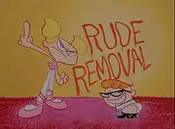 "Rude Removal" is a cartoon segment originally produced for the animated television series Dexter's Laboratory for Cartoon Network. It was intended to air as part of an episode from the second season in 1997. In the segment, Dexter and Dee Dee are accidentally split into two pairs, a polite pair and a rude pair, with the latter depicted as using profanity with bleep censorship.[1][2] The segment was only screened at some animation festivals before finally being released online by Adult Swim on January 22, 2013.[1][2]