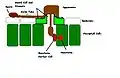 The spores of rust fungi may be dispersed by wind, water or insect vectors.[9] When a spore encounters a susceptible plant, it can germinate and infect plant tissues. A rust spores typically germinates on a plant surface, growing a short hypha called a germ tube. This germ tube may locate a stoma by a touch responsive process known as thigmotropism. This involves orienting to ridges created by epidermal cells on the leaf surface, and growing directionally until it encounters a stoma.[10]