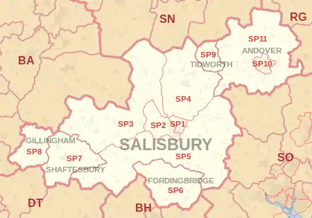 The SP postcode area, also known as the Salisbury postcode area,[2] is a group of eleven postcode districts in southern England, within six post towns. These cover south Wiltshire (including Salisbury and Tidworth) and parts of north Dorset (including Gillingham and Shaftesbury) and west Hampshire (including Andover and Fordingbridge).