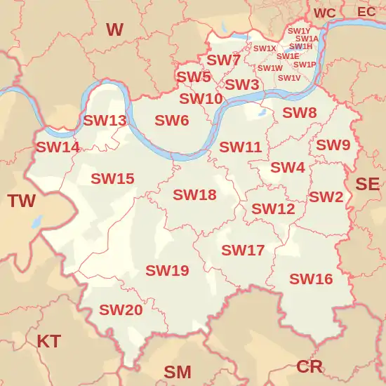 The SW postcode area covers parts of nine London Boroughs. North of the River Thames, it covers the southern parts of the City of Westminster, the Royal Borough of Kensington and Chelsea and the London Borough of Hammersmith and Fulham. South of the river, it covers all of the London Borough of Wandsworth, the western part of the London Borough of Lambeth, the northern parts of the London Boroughs of Merton and Croydon, the northeastern part of the London Borough of Richmond upon Thames, and a very small part of Royal Borough of Kingston upon Thames.[6][7]
