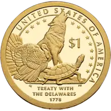 The 2013 dollar commemorates the Treaty with the Lenape in 1778, the first formal treaty between the United States and a Native American tribe. The coin depicts a turkey, a howling wolf, and a turtle—symbols of the Lenape.[17] Its design was created by Susan Gamble as part of the Artistic Infusion Program, and engraved by Phebe Hemphill.[18]