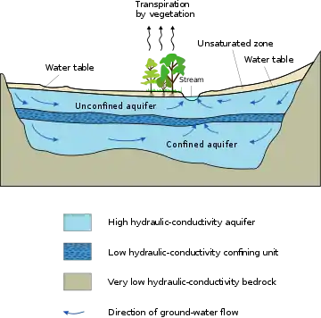The San Luis Valley contains an alluvial basin, the Alamosa Basin,[8][9] which lies at the north end of the Rio Grande rift. Deposits include the deeper alluvial strata, overlying Precambrian basement rock, Eocene alluvial deposits from a shallow Laramide depression, the Blanco Basin Formation; and Oligocene ash and lava flows associated with the Conejos Formation,[10] is the Santa Fe formation, mixed alluvium and lava outflows from the San Juan volcanic field to the west; later strata comprise the Alamosa formation, alternating layers of sand, gravel, and clay. The relatively impermeable clay layers trap ground water in the "confined aquifer" which, if tapped, supplies artesian wells. Surface waters, including the Rio Grande and other streams, are hydrologically connected to the "unconfined aquifer" a shallow ground water formation which underlies much of the valley. The deeper confined aquifers have sufficient hydrological connection with the surface waters of the valley that they are not considered for the purposes of Colorado water law "nontributary" waters which could legally be mined.[11][12] Streams which flow into the valley, particularly the Rio Grande, have deposited alluvial fans where they emerge from higher terrain onto the valley floor.[13]