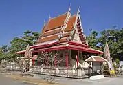 Wat Sanuan Wari hosts fewer murals, although they are often used to illustrate the story in books and other media. One of the murals depicts Sinxay, Sangthong and Siho fighting the giant snake.[3][20] While Wat Chaisi and Wat Sanuan Wari are located near Khon Kaen, the regional center of Isan, Wat Photaram is situated further away, in Maha Sarakham. In this temple scenes from Sang Sinxay are depicted on a single outside wall, covering it entirely. The scenes depicted are different from those found in other temples, including one scene portraying the battle between the nagas led by Nak Valoonarat and Sinxay, helped by the khut.