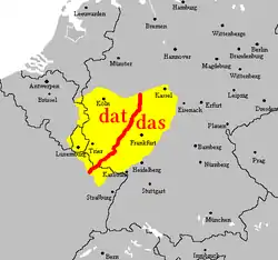 In German linguistics, the Sankt Goar line, das–dat line, or was–wat line is an isogloss separating the dialects to the north, which have a t in the words dat (English that) and wat (English what), from the dialects to the south (including standard German), which have an s: das, was. The line runs from east to west and crosses the river Rhine at the town of Sankt Goar.