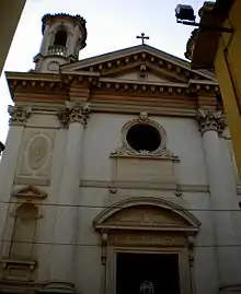 The church arose adjacent to the oratory of Sant Croce or Sala del Redentore. Documents from 1181 state a chapel at the site, adjacent to a leprosarium, was dedicated to the Holy Cross. The church became a parish in 1308. In 1606, the parish came under the rule of the Somaschi Fathers, who established a school at this site. The commission to build the present Rococo style church was given to a lay brother of the order, Francesco Vecelli (1695–1759). Construction began in 1737 and was completed in 1749. Under Napoleonic rule, the Somaschi were expelled and the church came under control of secular clergy. The belltower was built in 1907.
