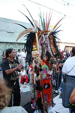 After the Spanish conquest of the Aztec Empire, the worship of death diminished but was never eradicated.[17] Judith Katia Perdigón Castañeda has found references dating to 18th-century Mexico. According to one account, recorded in the annals of the Spanish Inquisition, indigenous people in central Mexico tied up a skeletal figure, whom they addressed as "Santa Muerte," and threatened it with lashings if it did not perform miracles or grant their wishes.[9] Another syncretism between Pre-Columbian and Christian beliefs about death can be seen in Day of the Dead celebrations. During these celebrations, many Mexicans flock to cemeteries to sing and pray for friends and family members who have died. Children partake in the festivities by eating chocolate or candy in the shape of skulls.[18] Perdigón Castañeda, Thompson, Kingsbury, and Chesnut have countered the argument proposed by Malvido, Lomnitz, and Kristensen that Santa Muerte's origins are not Indigenous, suggesting that Santa Muerte derives from authentic Indigenous beliefs. For Malvido this stems from Indigenist discourse originating in the 1930s. Nevertheless, through ethnoarchaeological researches by Kingsbury and Chesnut as well as archival work by Perdigón Castañeda, proof has been established that there are clear links between pre-Columbian death deity worship and Santa Muerte supplication. As Kingsbury has pointed out, to deny the Indigenous roots of Santa Muerte is to promote neo-colonialism and the denial of Indigenous influences and cultures as important still in the current context.