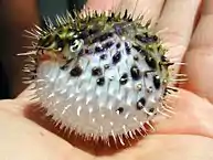 Large, pelagic mats of Sargassum in the Sargasso Sea act as one of the only habitats available for ecosystem development; this is because the Sargasso Sea lacks any land boundaries.[7] The Sargassum patches act as a refuge for many species in different parts of their development, but also as a permanent residence for endemic species that can only be found living on and within the Sargassum.[8] These endemic organisms have specialized patterns and colorations that mimic the Sargassum and allow them to be impressively camouflaged in their environment. In total, these Sargassum mats are home to more than 11 phyla and over 100 different species.[9] There is also a total of 81 fish species (36 families represented) that reside in the Sargassum or utilize it for parts of their life cycles.[10] Other marine organisms, such as young sea turtles, will use the Sargassum as shelter and a resource for food until they reach a size at which they can survive elsewhere. This community is being affected by humans due to overfishing, trash and other types of pollution, and boat traffic, which could eventually lead to the demise of this diverse and unique habitat.[8] Below is a list of organisms that are associated with the Sargassum in the Sargasso Sea.