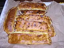 Scaccia (plural: scacce) or scacciata is a stuffed flat bread in Sicilian cuisine. Scaccia is made with a very thin rectangular layer of dough, folded on itself three or four times. It can be stuffed with different ingredients, the more common variations are ricotta cheese and onion, cheese and tomato, tomato and onion, or tomato and eggplant, depending on location, taste, or season. It is baked and can be eaten hot or cold. "Scacciata" derives from the Sicilian word meaning to drive away, equivalent to the Italian word "schiacciata" meaning to crush or to flatten. Scaccia can be found in Ragusa and Siracusa,[1][2][3][4][5] as well as some Sicilian-American communities (namely Middletown, Connecticut).[6][7][8]