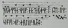 [7] Codex Runicus (AM 28 8vo) is the most famous of several manuscripts from the 13th to 15th centuries containing handwritten copies of the Scanian Law.[8][9] The second part of the Codex Runicus manuscript consists of two short historical texts: a fragment of a list of Danish kings and a chronicle beginning with the legendary Danish king Hadding's son Frode and ending with Eric VI of Denmark. Following the historical texts is a description of the oldest border between Denmark and Sweden and at the last leaf, the notes and words of the oldest preserved piece of music known in Denmark,[10] a verse with accompanying musical notation on a four-line staff – the first musical notations written in Scandinavia.
