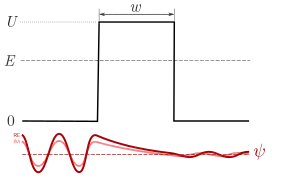 The simplest model of tunneling between the sample and the tip of a scanning tunneling microscope is that of a rectangular potential barrier.[15][5] An electron of energy E is incident upon an energy barrier of height U, in the region of space of width w. Electron's behavior in the presence of a potential U(z), assuming one-dimensional case, is described by wave functions that satisfy Schrödinger’s equation,