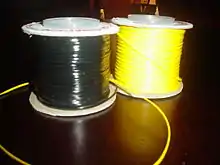 The most common kind of thread used for the craft is flat and comes in many colors, sometimes called "gimp thread". Another kind of scoubidou thread is supple, round and hollow plasticized PVC tubes usually about 80 centimetres in length. They are sold in various colors, sizes and types, and are used to make items by binding them together with knots. On account of their elasticity and hollow cross-section—which allow them to collapse and deform when pulled—they form tight and stable knots. Key chains, friendship bands and other trinkets are most commonly woven, although more complicated shapes and figures can also be created.[2]