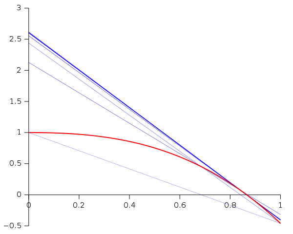 The following graph shows the function f in red and the last secant line in bold blue. In the graph, the x intercept of the secant line seems to be a good approximation of the root of f.