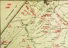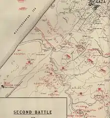 All of the Desert Column mounted and infantry divisions had fought during the first battle of Gaza, when the column's 53rd (Welsh) Division had been heavily involved.[6] This "encounter battle" by the mounted divisions emphasised speed and surprise,[7] at a time when Gaza had been an outpost garrisoned by a strong detachment on the flank of a line stretching inland from the Mediterranean Sea.[8]