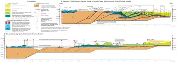 The earliest attempts to produce restored sections were on foreland fold and thrust belts.[2] This technique assumed a stratigraphic template with unit thicknesses either constant or smoothly varying across the section. Line lengths were measured on the present-day deformed section and transferred to the template, to rebuild the section as it was before deformation started. This method does not guarantee that area is conserved, only line length. The technique was applied to areas of extensional tectonics initially using vertical simple shear.[3][4] Over the next decade several types of commercial restoration software became available, allowing the technique to be routinely applied.