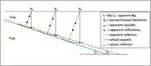 The situation is more complex in the case of a dipping reflector, as the first reflection originates from further up the direction of dip (see diagram) and therefore the travel-time plot will show a reduced dip that is defined the “migrator’s equation” :[5]