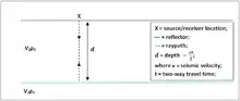 In the simplest geological setting, with a single horizontal reflector, a constant velocity and a source and receiver at the same location (referred to as zero-offset, where offset is the distance between the source and receiver), the geophysicist can determine the location of the reflection event by using the relationship: