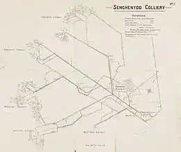 Senghenydd—Senghennydd in Welsh—is situated at the northern end of the Aber Valley, approximately four miles (6.4 km) north-west of Caerphilly[16][17] and eleven miles (18 km) north-west of Cardiff.[18] When geological surveys for coal began in 1890 it was a farming hamlet of around 100 people.[19][20] Coal was found, and sinking of the first mineshaft for Universal Colliery—which was owned and developed by William Lewis[lower-alpha 3]—began in 1891; the first coal was extracted in 1896.[17][22] The colliery's two shafts were both 1,950 feet (590 m) deep, the downcast Lancaster and the upcast York.[23][lower-alpha 4] Development of the pit coincided with the Boer War, and sectors of the underground workings were named after key places in the war, such as Pretoria, or the lifting of the sieges at Ladysmith, Mafeking and Kimberley.[20]