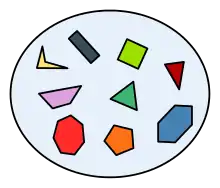 In mathematics, a set is a well-defined collection of distinct elements or members.[1][2][3] The elements that make up a set can be anything: people, letters of the alphabet, or mathematical objects, such as numbers, points in space, lines or other geometrical shapes, algebraic constants and variables, or other sets.[4] Two sets are equal if and only if they have precisely the same elements.[5] This is known as the axiom of extensionality.