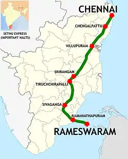 Sethu Superfast Express, is a Superfast train route of the Southern Railway zone of the Indian Railways and runs between Chennai Egmore and Rameswaram via Chord line. It is a standard train consisting of 23 coaches. The train covers a distance of 602 km (374 mi) with an average speed of 57 km/h (35 mph)