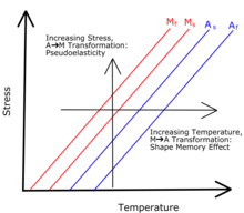 Here a load is isothermally applied to a SMA above the austenite finish temperature, Af, but below the martensite deformation temperature, Md. The figure above illustrates how this is possible, by relating the pseudoelastic stress-induced phase transformation to the shape memory effect temperature induced phase transformation. For a particular point on Af, it is possible to choose a point on the Ms line with a higher temperature, as long as that point Md also has a higher stress. The material initially exhibits typical elastic-plastic behavior for metals. However, once the material reaches the martensitic stress, the austenite will transform to martensite and detwin. As previously discussed, this detwinning is reversible when transforming back from martensite to austenite. If large stresses are applied, plastic behavior such as detwinning and slip of the martensite will initiate at sites such as grain boundaries or inclusions.[17][18] If the material is unloaded before plastic deformation occurs, it will revert to austenite once a critical stress for austenite is reached (σas). The material will recover nearly all strain that was induced from the structural change, and for some SMAs this can be strains greater than 10 percent.[19][20] This hysteresis loop shows the work done for each cycle of the material between states of small and large deformations, which is important for many applications.