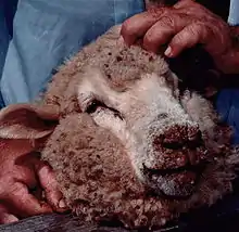 Common forms of preventive medication for sheep are vaccinations and treatments for parasites. Both external and internal parasites are the most prevalent malady in sheep, and are either fatal, or reduce the productivity of flocks.[23] Worms are the most common internal parasites. They are ingested during grazing, incubate within the sheep, and are expelled through the digestive system (beginning the cycle again). Oral anti-parasitic medicines, known as drenches, are given to a flock to treat worms, sometimes after worm eggs in the feces has been counted to assess infestation levels. Afterwards, sheep may be moved to a new pasture to avoid ingesting the same parasites.[32] External sheep parasites include: lice (for different parts of the body), sheep keds, nose bots, sheep itch mites, and maggots. Keds are blood-sucking parasites that cause general malnutrition and decreased productivity, but are not fatal. Maggots are those of the bot fly and the blow-fly, commonly Lucilia sericata or its relative L. cuprina. Fly maggots cause the extremely destructive condition of flystrike. Flies lay their eggs in wounds or wet, manure-soiled wool; when the maggots hatch they burrow into a sheep's flesh, eventually causing death if untreated. In addition to other treatments, crutching (shearing wool from a sheep's rump) is a common preventive method. Some countries allow mulesing, a practice that involves stripping away the skin on the rump to prevent fly-strike, normally performed when the sheep is a lamb.[116][117] Nose bots are fly larvae that inhabit a sheep's sinuses, causing breathing difficulties and discomfort. Common signs are a discharge from the nasal passage, sneezing, and frantic movement such as head shaking. External parasites may be controlled through the use of backliners, sprays or immersive sheep dips.[23]