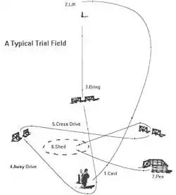 The exact layout of the trial field can vary significantly. Most experienced handlers agree that there are certain elements that are important to ensure that the challenge to the dog and handler is a fair and complete test. For USBCHA-sanctioned trials, these elements include:[3][4]
