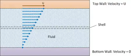 A fluid is flowing between and in contact with two horizontal surfaces of contact area A. A differential shell of height Δy is utilized (see diagram below).