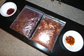 Shellac has traditionally been used as a dye for cotton and, especially, silk cloth in Thailand, particularly in the north-eastern region.[23] It yields a range of warm colours from pale yellow through to dark orange-reds and dark ochre.[24] Naturally dyed silk cloth, including that using shellac, is widely available in the rural northeast, especially in Ban Khwao District, Chaiyaphum province. The Thai name for the insect and the substance is "khrang" (Thai: ครั่ง).