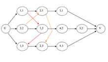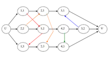 The first step is to draw out the precedence constraints in a graphical form called a graph (See Original Drawing picture). Each job originates at the "source", which we will label U on the graph. Each job will finish in a "sink" of jobs, which we will label V on the graph. Each row of nodes in the graph represents a job. Each node on the graph represents a task that is part of the job, the second number confirms the job being performed and the first number indicates what machine is being used for this task. At this point, the initial throughput time of each job should be calculated by adding up the processing times that the job takes on each of the machines (or rows). After the throughput time for each job has been calculated, the makespan for the system is determined by the longest throughput time of any individual job. This assumes no resource conflicts and gives a makespan of 22.