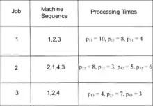 The Shifting Bottleneck Heuristic is used in manufacturing and service industries that include job shops with constraints on the order that the machines must be used for each job. A good example of a service industry that may use this technique is a hospital. The different areas within a hospital, such as physical examination, x-ray booth, cat scan, or surgery, could all be considered machines for this particular application. A precedence constraint in this context is when one machine must be used before another machine on any given job (or patient). These types of problems with multiple machines are known to be computationally very difficult. The processing time of each job on each machine is given (see chart on right for an example). Job j being performed on machine i is denoted ij. It is assumed that each machine can only work on one job at a time. The objective is to determine the schedule that will produce the shortest makespan.
