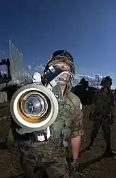 A shoulder-fired missile, shoulder-launched missile, man-portable rocket launcher, or man-portable missile is a rocket-propelled explosive projectile small enough to be carried by a single person and fired while held on one's shoulder. The word "missile" in this context is used in its original broad sense of a heavy projectile, and encompasses all guided missiles and unguided rockets. In many instances, although not technically defining all shoulder-fired missiles, the name bazooka is regularly used as an informal name, although the actual Bazooka is a type of unguided rocket launcher in its own right.