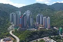 The estate comprises 18 blocks offering 11,123 public rental flats. It also includes a commercial complex with 59 shops and an indoor market.[1] The new estate sits on a hillside is linked to the lower-lying areas by footbridges and lift towers, providing easy access to Pok Hong Estate and Sha Tin Wai station.