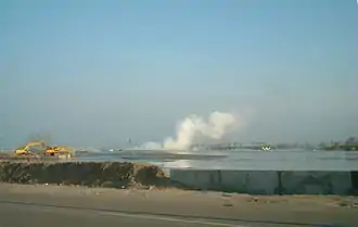 At its peak Lusi spewed up to 180,000 cubic meters (240,000 cu yd) of mud per day.[3] By mid August 2011, mud was being discharged at a rate of 10,000 cubic meters (13,000 cu yd) per day, with 15 bubbles around its gushing point. This was a significant decline from the previous year, when mud was being discharged at a rate of 100,000 cubic meters (130,000 cu yd) per day with 320 bubbles around its gushing point.[4] It is expected that the flow will continue for the next 25 to 30 years.[3][5] Although the Sidoarjo mud flow has been contained by levees since November 2008, resultant floodings regularly disrupt local highways and villages, and further breakouts of mud are still possible.[6]