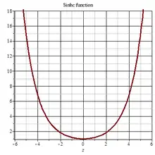 In mathematics, the Sinhc function appears frequently in papers about optical scattering,[1] Heisenberg Spacetime[2] and hyperbolic geometry.[3] It is defined as[4][5]