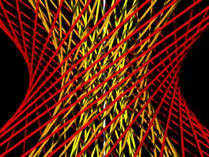 If one rotates a line L around another line M skew but not perpendicular to it, the surface of revolution swept out by L is a hyperboloid of one sheet. For instance, the three hyperboloids visible in the illustration can be formed in this way by rotating a line L around the central white vertical line M. The copies of L within this surface form a regulus; the hyperboloid also contains a second family of lines that are also skew to M at the same distance as L from it but with the opposite angle that form the opposite regulus. The two reguli display the hyperboloid as a ruled surface.