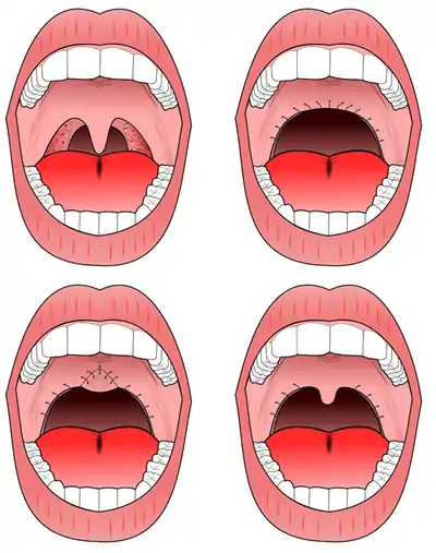 The procedure most commonly performed for sleep apnea is the uvulopalatopharyngoplasty (UPPP). This involves removal of the tonsils if still present, and a subsequent palatal procedure. The tonsil pillars are often sutured closed—and the uvula is either trimmed, cut, folded, reshaped, or sutured to the soft palate.[7]