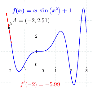 Its value at a point on the function gives us the slope of the tangent at that point. For example, let y=x2. A point on this function is (-2,4). The derivative of this function is dy/dx=2x. So the slope of the line tangent to y at (-2,4) is 2·(-2) = -4. The equation of this tangent line is: y-4=(-4)(x-(-2)) or y = -4x - 4.