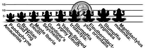 Frogs include the smallest vertebrates known. The smallest known frog species is Paedophryne amauensis, with a snout-vent length reported as 7.7 mm, which occurs among leaf-litter in the tropical montane forests of New Guinea. Other very small frogs include Brachycephalus didactylus from Brazil (reported as 9.6–9.8 mm), several species of Eleutherodactylus such as E. iberia (around 10 mm) and E. limbatus (8.5–12 mm) and Eleutherodactylus orientalis (12.5 mm) from Cuba, Gardiner's Frog Sechellophryne gardineri from the Seychelles (up to 11 mm), several species of Stumpffia such as S. tridactyla (8.6–12  mm) and S. pygmaea (males 10–12.5 mm; females: 11 mm) and Wakea madinika (males: 11–13 mm; females: 15–16 mm) from Madagascar. Paedophryne swiftorum (body length 8.5 mm) is not included in the smallest vertebrates known with other nine species of frogs.[33] The two species Microhyla borneensis (males:10.6–13 mm; females:16–19 mm)[34][35] and Arthroleptella rugosa (males: 11.9–14.1 mm; females:15.5mm) were once the smallest known frogs from the Old World. In general these extremely small frogs occur in tropical forest and montane environments. There is relatively little data on size variation among individuals, growth from metamorphosis to adulthood or size variation among populations in these species. Additional studies and the discovery of further minute frog species are likely to change the rank order of this list.