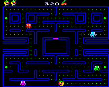 The main difference in gameplay between Pac-Man and Snapper is the behaviour of the ghosts (or monsters). In Pac-Man, each ghost has its own personality and follows set patterns for each level. The red ghost also travels at double speed after a certain number of dots are eaten. In Snapper, the monsters begin each level by patrolling their corners a set number of times before breaking from their route to chase the Snapper. The time before breaking the route is reduced for each level until on later levels, the monsters chase Snapper almost immediately. The only real difference between the monsters is the corner they patrol and how soon they break from their route (e.g. the red ghost is always the first). Also, in Pac-Man, the main character slows when eating dots (so ghosts can catch up to him) but this does not happen in Snapper. These changes lead to a game which is much easier in the early levels but gets progressively more difficult[5] so games tend to last longer.