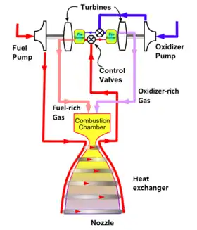 Raptor has been claimed to be able to deliver "long life ... and more benign turbine environments".[25][21] Specifically, Raptor utilizes a full-flow staged combustion cycle, where all the oxidizer—with a low-fuel ratio—will power the oxygen turbine pump, and all the fuel—with a low-oxygen ratio—will power the methane turbine pump. Both streams—oxidizer and fuel—will be mixed completely in the gas phase before they enter the combustion chamber. Prior to 2014, only two full-flow staged-combustion rocket engines had ever progressed sufficiently to be tested on test stands: the Soviet RD-270 project in the 1960s and the Aerojet Rocketdyne Integrated Powerhead Demonstrator in the mid-2000s.[26][21][27]