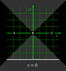 Fig. 2-6 illustrates the use of spacetime diagrams in the analysis of the relativity of simultaneity. The events in spacetime are invariant, but the coordinate frames transform as discussed above for Fig. 2‑3. The three events (A, B, C) are simultaneous from the reference frame of an observer moving at v = 0. From the reference frame of an observer moving at v = 0.3c, the events appear to occur in the order C, B, A. From the reference frame of an observer moving at v = −0.5c, the events appear to occur in the order A, B, C. The white line represents a plane of simultaneity being moved from the past of the observer to the future of the observer, highlighting events residing on it. The gray area is the light cone of the observer, which remains invariant.