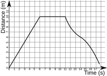 In the study of 1-dimensional kinematics, position vs. time graphs (also called distance vs. time graphs, or p-t graphs) provide a useful means to describe motion. The specific features of the motion of objects are demonstrated by the shape and the slope of the lines.[1] In the accompanying figure, the plotted object moves away from the origin at a uniform speed of 1.66 m/s for six seconds, halts for five seconds, then returns to the origin over a period of seven seconds at a non-constant speed.