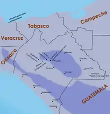 The earliest human inhabitants of Chiapas were foragers living in the northern highlands and along the coastal strip from approximately 6000 BC until about 2000 BC.[13] For approximately the last two millennia BC, the majority of the territory that is now covered by the state of Chiapas was occupied by Zoque-speaking peoples. Gradually, Mayan-speakers began to make inroads from the east and, from about 200 AD, Chiapas was divided roughly equally between the Zoques in the western half and Maya in the eastern half; this distribution continued up to the time of the Spanish conquest.[14]