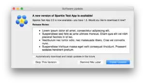 Sparkle is an open-source software framework for macOS designed to simplify updating software for the end user of a program. Sparkle's primary means of distributing updates is through "appcasting," a term coined for the practice of using an RSS enclosure to distribute updates and release notes.